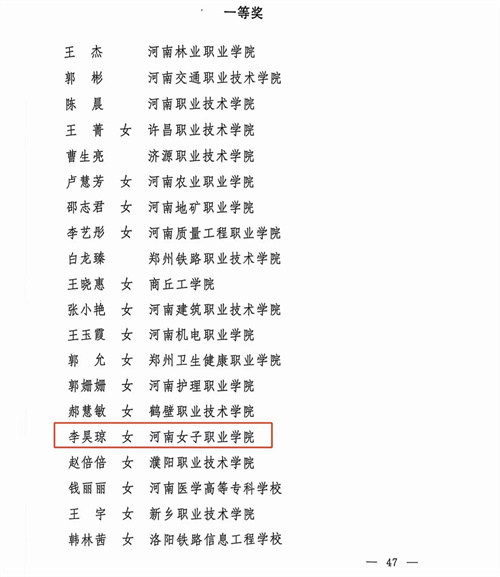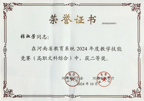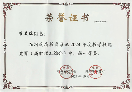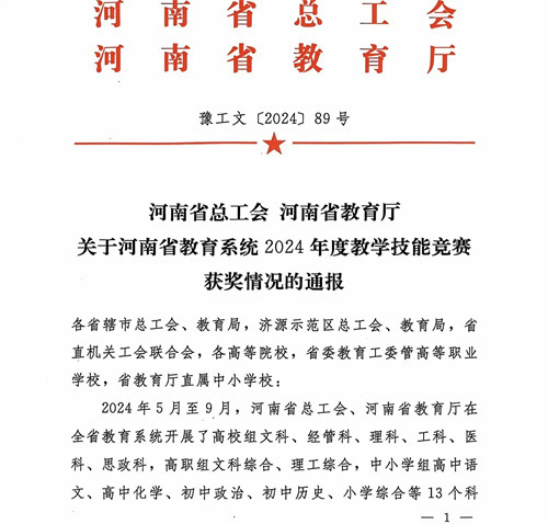 近日,河南省总工会、河南省教育厅联合下发《关于河南省教育系统2024年度教学技能竞赛获奖情况的通报》(豫工文〔2024〕89号)文件。在此项竞赛中,我校教师成功夺得高职理工综合一等奖和高职文综二等奖。