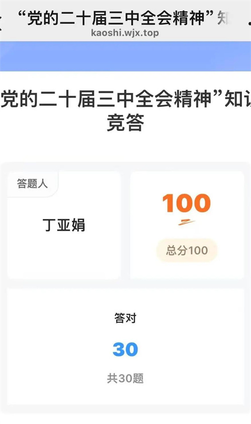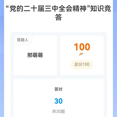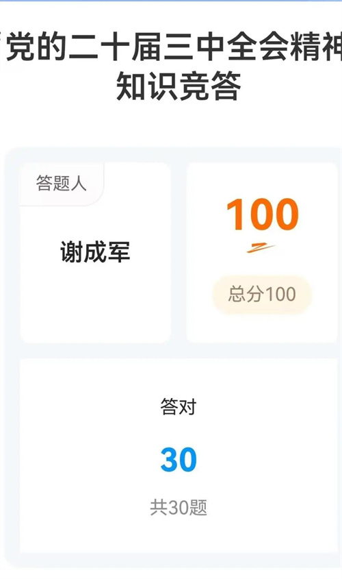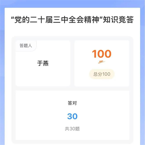 为深入学习党的二十届三中全会精神,校工会特别组织了线上知识竞答活动。竞答内容涵盖《中国共产党第二十届中央委员会第三次全体会议公报》《中共中央关于进一步全面深化改革推进中国式现代化的决定》和习近平总书记《关于< 中共中央关于进一步全面深化改革、推进中国式现代化的决定>的说明》等。活动采用线上答题的形式,每人需完成 30 道题目,包括 20 道单选题和10 道多选题,满分100分。大家积极参与答题,展示自己扎实的理论知识。