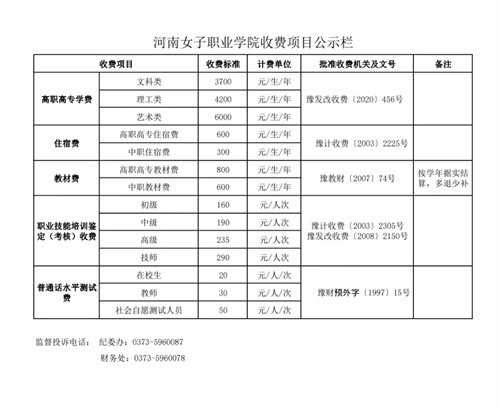 河南女子职业学院收费项目公示栏