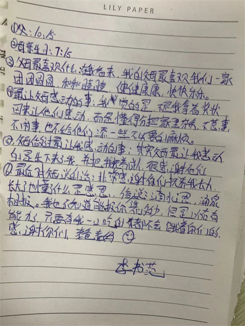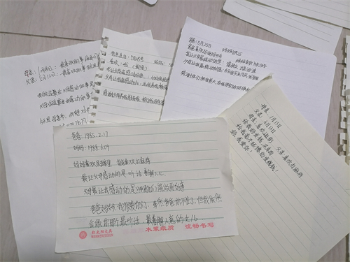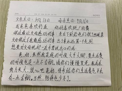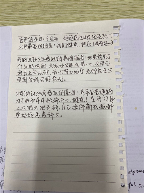 班会上,同学们拿出纸和笔,分别写下父母的生日、父母喜欢的东西、做过最让父母感动的事情、父母做过令你最感动的事情和想要对父母说却一直未曾说出口的话,同学们一笔一划认真书写。班会结束后,同学们纷纷表示:以后要多陪伴父母,让自己变得更懂事更体贴。