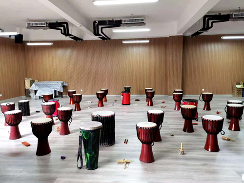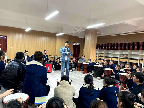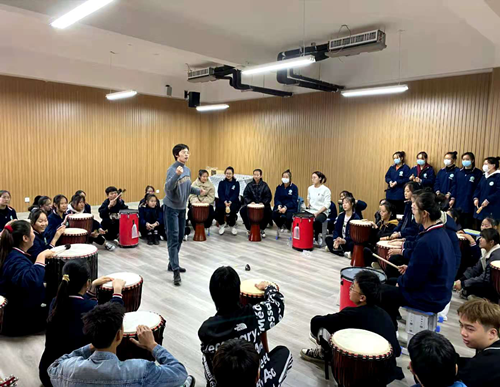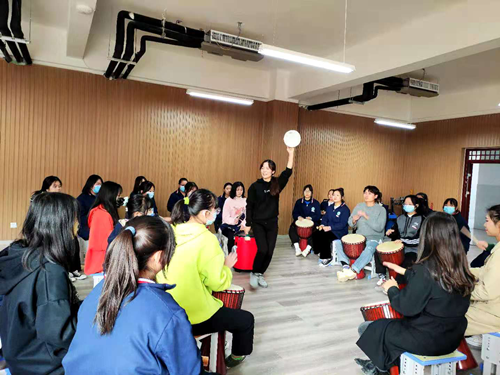 活动中,学生有序走进实训室,在老师极具节奏的引导声中分成两排围坐在一起,在老师充满感染力的肢体语言、丰富的表情和亲切的话语引导下,慢慢放下戒备,从最初的不知所措到自然的与鼓击掌。最终,实训室内几十个鼓伴随着沙槌、三角铁、手铃等打击乐器一起奏响。同学们在引导师的指引下,有时共同配合演奏,有时个人solo展示,在敲击中找到属于自己的节奏,在活动中体验合作与沟通。