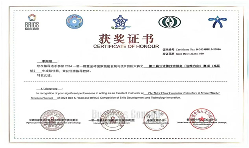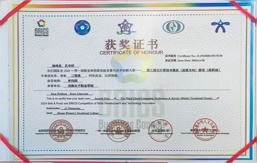 2024年12月20日,2024“一带一路暨金砖国家技能发展与技术创新大赛之云计算技术服务(运维方向)赛项【高职组】国内赛决赛在四川长江职业学院成功举办。信息工程学院23级学生大数据技术2班孔令轩、信息安全技术应用2班杨伟东凭借扎实的专业基础和卓越的技术能力,荣获国赛二等奖的佳绩。