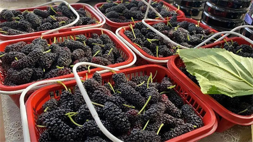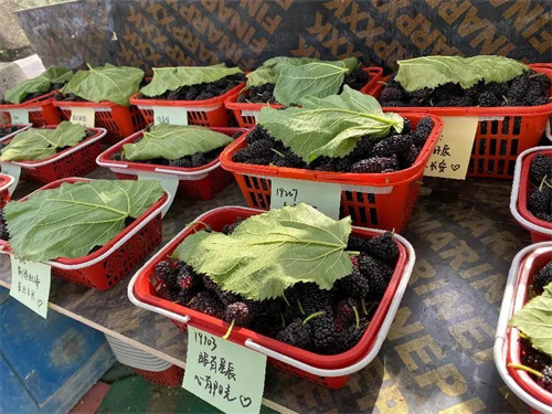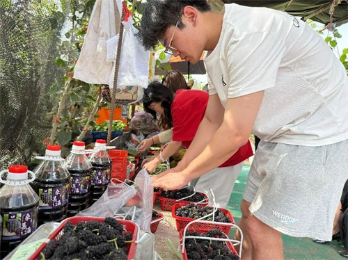 活动现场,桑葚园内枝繁叶茂,一串串饱满多汁的桑葚挂满枝头,紫红相间,散发着诱人的果香。学生们穿梭其中,一边亲手采摘桑葚,一边通过手机镜头向直播间的观众展示桑葚的生长环境和新鲜程度。他们热情洋溢地介绍桑葚的产品特色,如富含维生素、矿物质和抗氧化物质,既能鲜食,又能加工成果干、桑葚酒等多种产品。