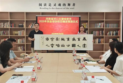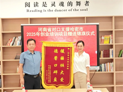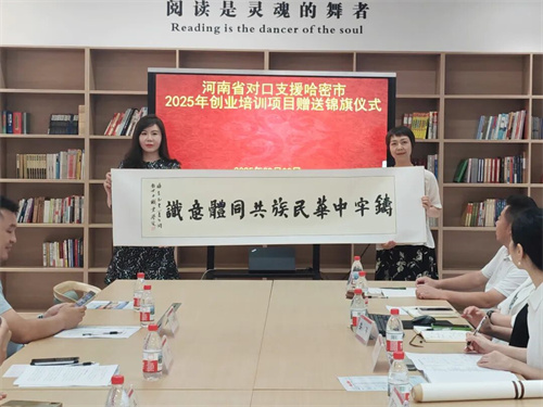 9月2日,河南省对口支援哈密市2025年创业培训项目锦旗赠送仪式在我校举行,标志着豫哈两地在对口支援与合作交流方面取得又一重要阶段性成果。河南省广播电视局公共服务处二级调研员徐冉、河南省电子商务协会秘书长张苏丰、中国教师报中国教育新闻网总监王书栋、河南悦诚商业管理有限公司董事长胡伟民等嘉宾出席;我校校长郭丽萍,党委副书记马立,副校长周旷怡及相关部门负责人共同参加。