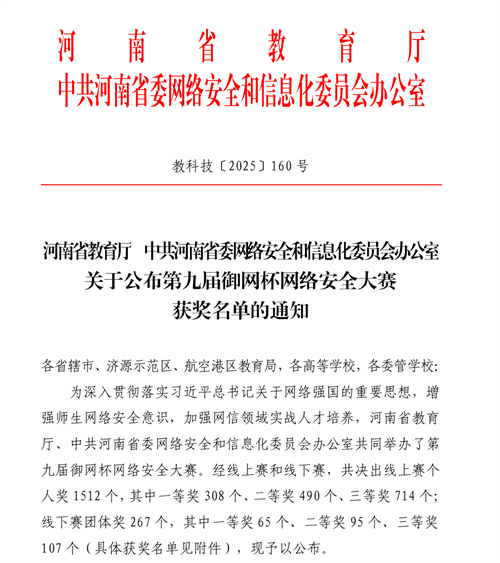 近日,河南省教育厅、中共河南省委网络安全和信息化委员会办公室共同举办了第九届御网杯网络安全大赛,我校信息工程学院参赛师生表现优异,成功斩获线上赛省赛一等奖 2 名、二等奖 3 名、三等奖5名的成绩,实现了我校在信息安全竞赛领域的新的飞跃。