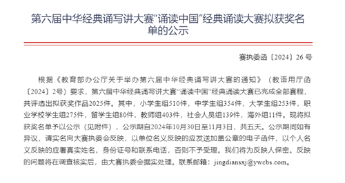 近日,由教育部主办的第六届中华经典诵写讲大赛“诵读中国”经典诵读比赛、“笔墨中国”汉字书写大赛获奖名单正式公布。我校师生连连获奖,佳绩不断,成绩取得明显突破。