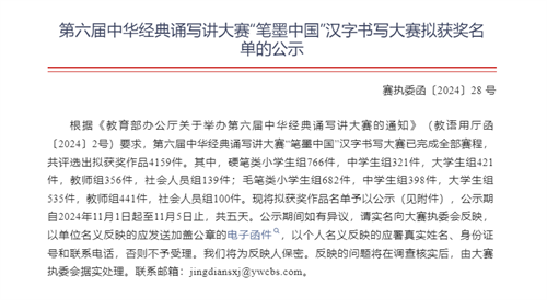 据悉,本次大赛经过全国各省级语委和教育部门选拔推荐,共评选出拟获奖作品4159件。其中,硬笔类小学生组766件,中学生组321件,大学生组421件,教师组356件,社会人员组139件;毛笔类小学生组682件,中学生组398件,大学生组535件,教师组441件,社会人员组100件。