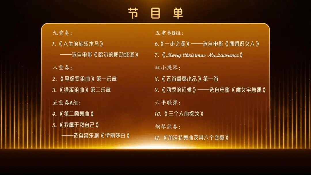 此次演出曲目经过精心甄选编排,涵盖九重奏、八重奏、五重奏、双小提琴、六手联弹及钢琴独奏等多种演奏形式,表演者配合默契、技艺精湛,充分展现了每部作品的艺术内涵,赢得了现场观众的阵阵掌声。