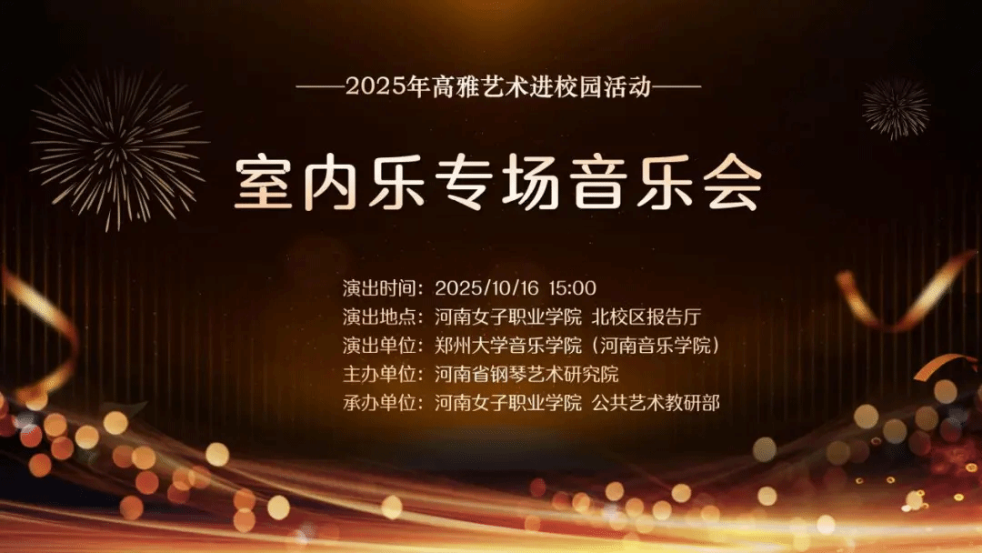 2025年10月16日下午,河南女子职业学院2025年高雅艺术进校园室内乐专场音乐会在北校区报告厅举办。活动演出单位为郑州大学音乐学院(河南音乐学院),主办单位为河南省钢琴艺术研究院,我校公共艺术教研部承办。副校长曹晖、徐红娟、周旷怡应邀出席,音乐与传媒学院全体教师以及五百余名学生现场观看。