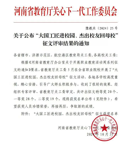 近日,河南省教育厅关工委正式公布了2024年度“大国工匠进校园、杰出校友回母校”征文活动的获奖名单。我校在此次比赛中荣获了特等奖一项、一等奖两项以及二等奖两项的佳绩。