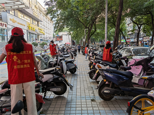 志愿者们紧密配合,耐心将乱停放、占道的自行车、电动车,摆放到停车区;将东倒西歪的车子扶正,摆放整齐。在整摆过程中,志愿者们也不忘拾捡地面垃圾,向居民倡导宣传文明共享、绿色出行的理念,并劝导居民主动将车辆停放在停车区,为打造和谐、有序、文明的城市环境奠定了良好的基础。