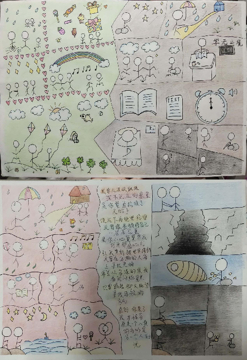 学生们用绘画的形式大胆表达了自己的情感,填补内心世界的空白,将潜意识内压抑的感情与冲突呈现出来,并在绘画的过程中得到缓解与满足,个人特点及个性差异也在他们的心理绘画作品中体现的淋漓尽致。
