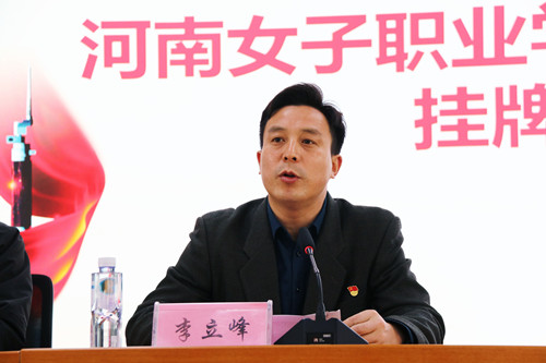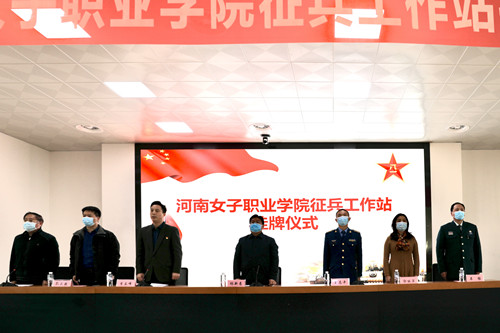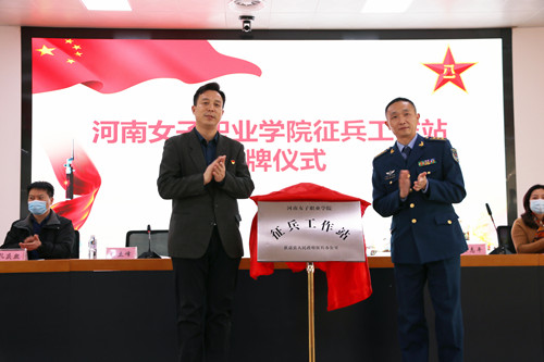 县人民武装部政委王志平与我校校领导李立峰共同为河南女子职业学院征兵工作站揭牌。