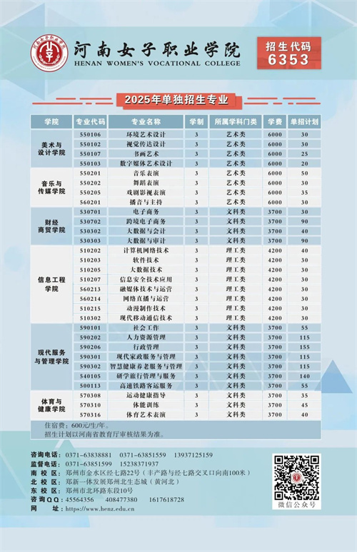 第八条 学校招生就业处是组织和实施招生工作的常设机构,在学校招生工作领导小组的领导下,全权负责河南女子职业学院招生工作,教务处负责考试整体工作。所有招生信息均通过河南女子职业学院官网、河南女院阳光招生微信公众号发布。