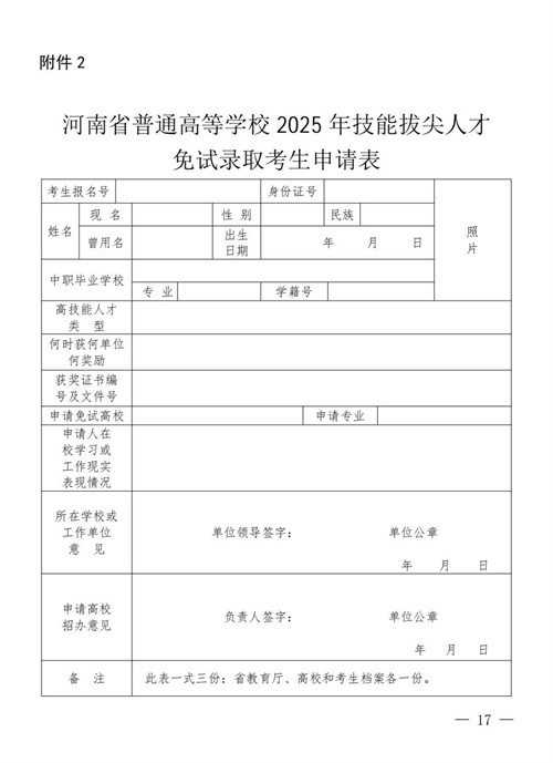 1.考生本人在规定时间内填写《河南省普通高等学校2025年技能拔尖人才免试录取考生申请表》(详见附件2),提出免试入学申请。由生源学校负责确认考生获奖情况。