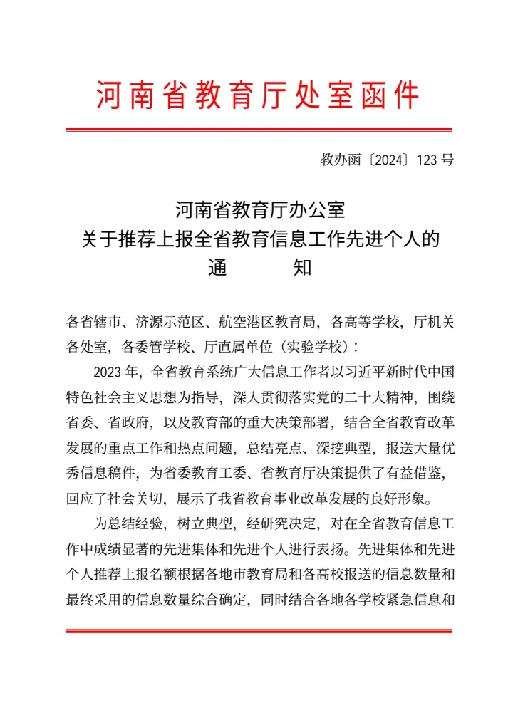 河南省教育厅办公室关于推荐上报全省教育信息工作先进个人的通告