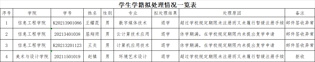 以下名单中的学生已经达到退学处理条件,但是拒绝办理退学手续,辅导员与学生本人及其家长多次联系均未回复,学院已于2023年12月22日、26日将王耀坤等4名同学的退学拟处理意见告知书通过邮政EMS邮寄至学生登记的家庭地址,截至2024年1月5日3人邮件签收异常、联系电话有误,未签收,1人拒收,同步辅导员反映联系不上学生本人及其家长。