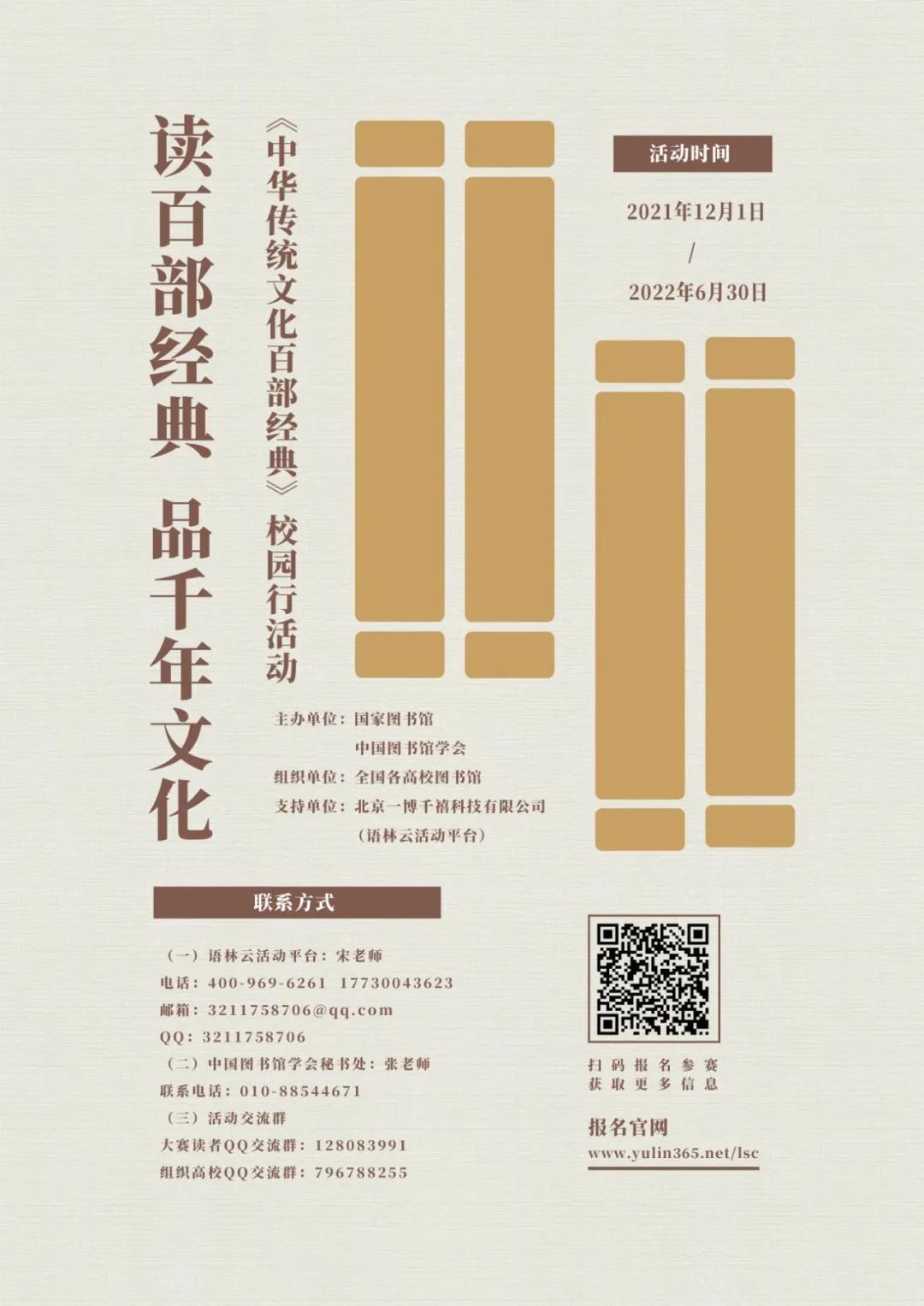 为进一步深入贯彻落实习近平总书记在给国家图书馆老专家的回信精神,提升大学生群体对中华传统文化的理解和认知,更好地继承和弘扬优秀传统文化,我校图书馆组织学生参加由国家图书馆、中国图书馆学会主办的“读百部经典 品千年文化”——《中华传统文化百部经典》校园行活动,具体事宜通知如下:
