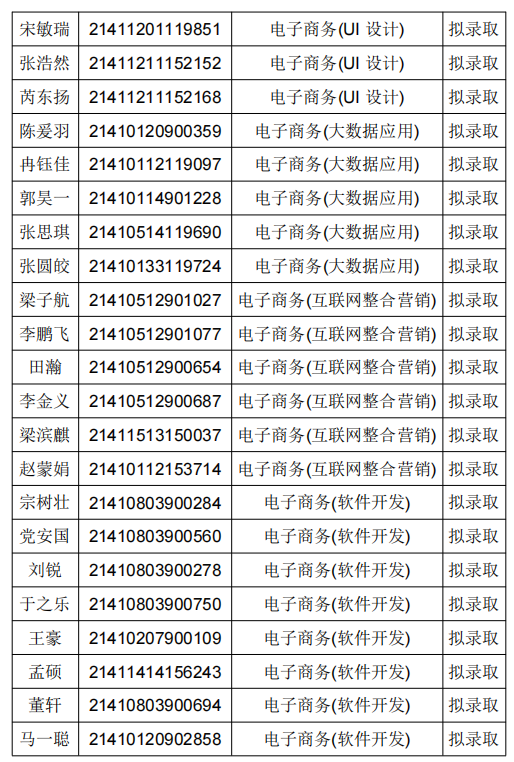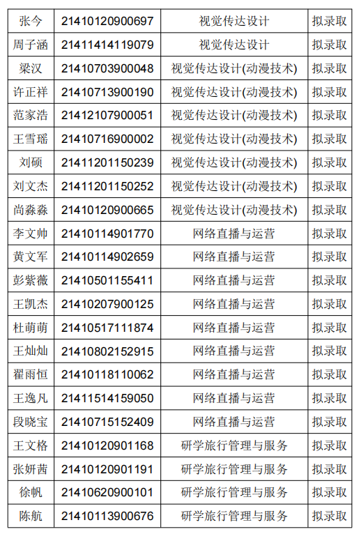根据《2021年河南女子职业学院单独考试招生章程》录取规则,经学院高职单独考试工作领导小组研究决定,现将我院2021年高职单独考试招生拟录取名单进行公示: