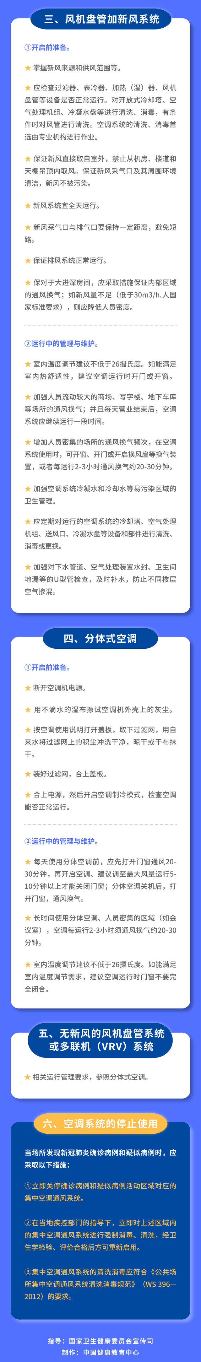 为科学指导、规范办公场所、公共场所和住宅等空调的运行管理和使用,有效降低新冠肺炎传播风险,国家卫健委制定了《夏季空调运行管理与使用指引》。现将《指引》转发,请大家认真学习,安全、卫生、正确地使用空调。