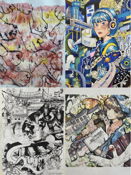 “她创作”:“执笔绘心·看见她力量”通过艺术表达女性身份与社会价值,作品承载了学生的青春热望,既是当代女大学生精神世界的具象化呈现,也为校园美育注入了鲜活的生命力。