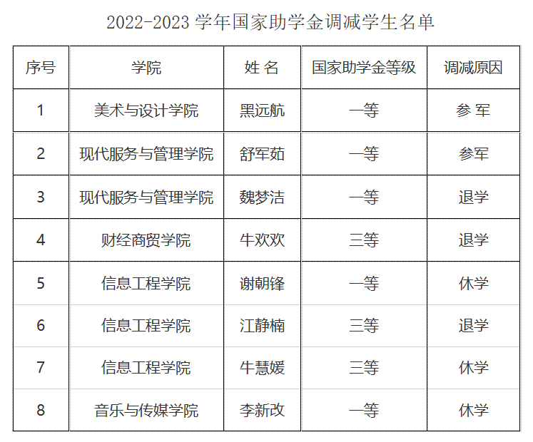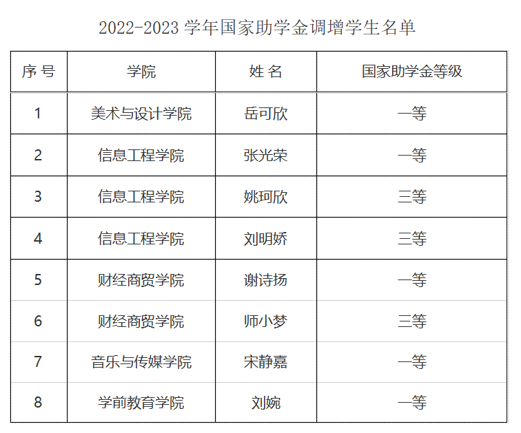 近日,学生处及学生资助管理中心组织各学院对获得2022—2023学年国家助学金的学生进行了资格复核8名学生因退学、休学、参军原因,不享受国家助学金并转助其他8名符合条件的家庭经济困难学生经学生申请、学院审核、学生资助管理中心核实确认,现将名单公示如下