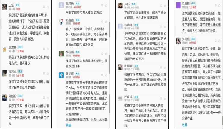 开设成效:开设课程以来,我们通过对已进行的家庭教育课程实施情况的反馈和调查,发现学生对家庭教育的重要性有了新的认识。成家模块,使学生对婚恋观有了新的认识,对于家庭的建立有了更全面深刻的思考,对女大学生关于婚恋的困惑有重要的启发,对男大学生的婚恋态度和婚恋责任心也有积极的促进。爱家模块,我们由苏武牧羊的豫剧片段导入,厚植家国情怀,提升了大学生爱与被爱的能力,加深了对家的理解和感情。和家模块,是最受欢迎的模块,增进了学生对亲密关系、亲子关系、隔代关系的认知,其中家庭沟通、家庭关系、情绪管理的具体方法和技术,直接帮助学生在一定程度上改善了与父母的沟通方式,化解了部分家庭矛盾,增进了亲子关系,减少了因家庭问题而进行心理咨询的数量和频率。齐家和美家模块的测评还未实施到。我们设想在齐家模块,通过弘扬中华优秀家庭文化,尤其是深度挖掘河南本土的家庭教育故事,传承好家风、好家训、好家教。美家模块,我们拟侧重实践,注重与劳动教育、思政实践课的结合,依托我们美术学院,设计美家实践教育项目,通过美家的具体能力培养,如家庭环境设计、家务能力培养等,通过劳动的形式,让学生深切体验家庭之美好。学生反馈如下图: