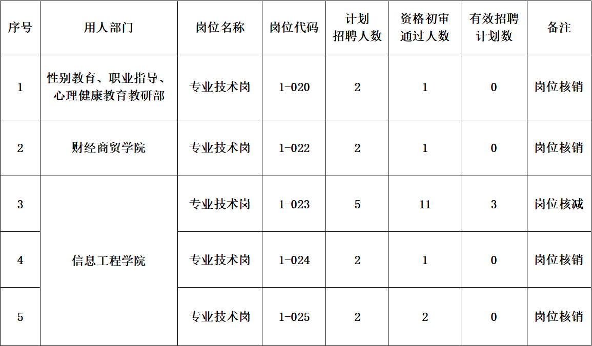根据河南女子职业学院2023年公开招聘人事代理人员公告规定结合网上报名、资格初审情况,现将部分岗位核销(减)情况公告如下:
